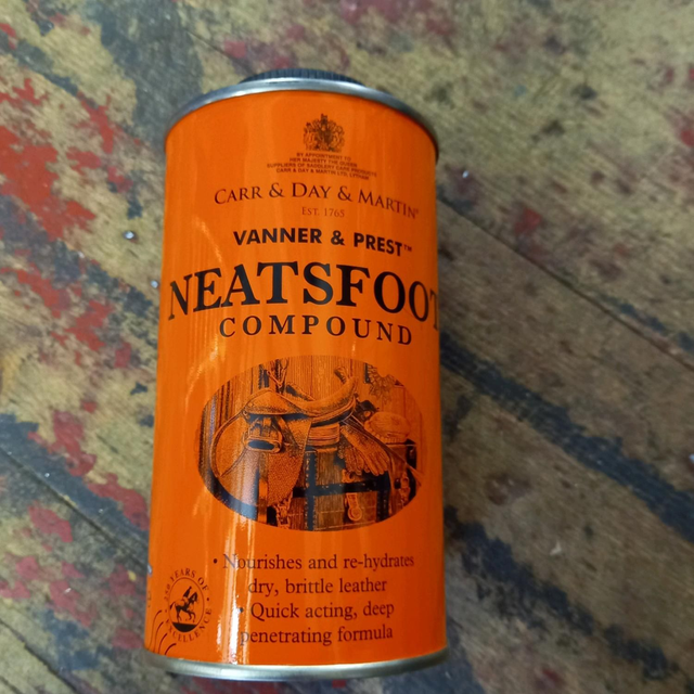 Carr & Day & Martin Neatsfoot Oil: 500ml Vanner & Prest Neatsfoot Compund - Nourishes and restores old and new leather Description Fast acting, deep penetrating formula containing pure Neatsfoot Oil and mineral oils that will not rot stitching. Fantastic for softening stiff or new leather, also excellent for restoring leather after storage or prolonged use in rain. Can be used routinely to nourish and rehydrate or as a preventative to avoid drying and cracking.